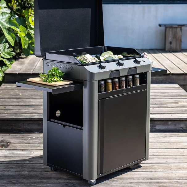 Il possĂšde 2 tablettes latĂ©rales qui vous permettront d’avoir un espace de travail Ă proximitĂ© pour un confort optimal. Pour ranger votre bouteille de gaz, le chariot prĂ©voit un espace dĂ©diĂ©e, sous la plancha, cachĂ© par un rideau noir.