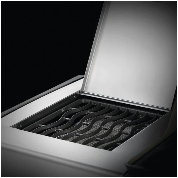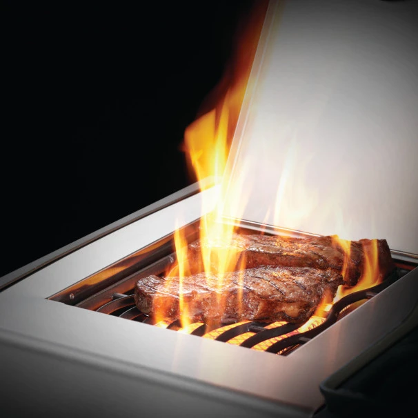 - Brûleur latéral infrarouge SIZZLE ZONE™, petit pour préparer facilement des plats de wok et des steaks grillés avec la marque ultime! La zone de taille infrarouge atteint rapidement une température pouvant atteindre 800°C et garantit des arômes torréfiés uniques.