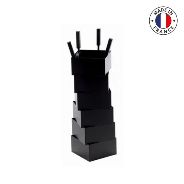 Le serviteur en acier noir givre Torsion se glisse facilement dans une pièce de vie à la décoration contemporaine. L’aspect de ce serviteur est original, il se présente sous la forme de 6 boîtes noires de diamètre différent empilées en décalé.